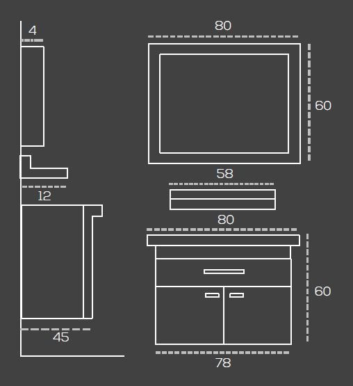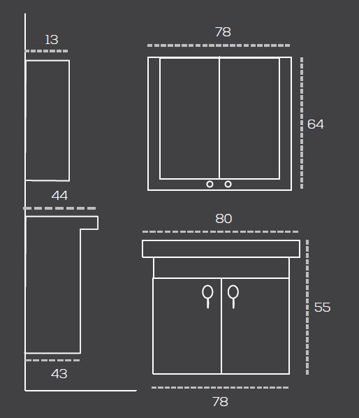 - Üst Modül + Ayna: EN: 78 cm BOY: 64 cm DERİNLİK: 13 cm