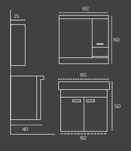 - Üst Modül + Ayna: EN: 62 cm BOY: 60 cm DERİNLİK: 15 cm