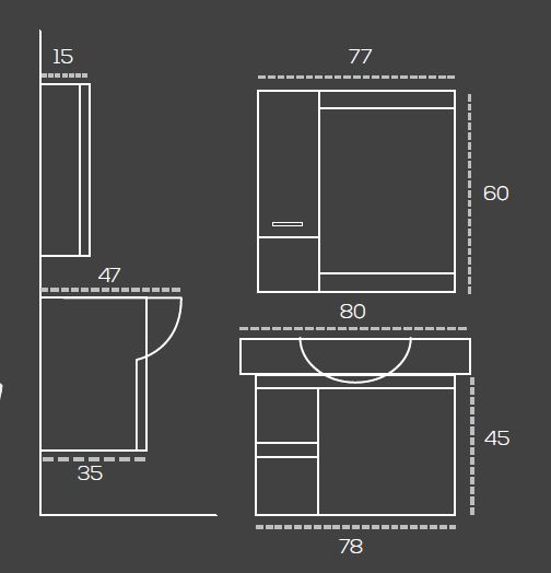 - Верхний модуль+Зеркало: 77cm x 60cm x 15cm (depth)